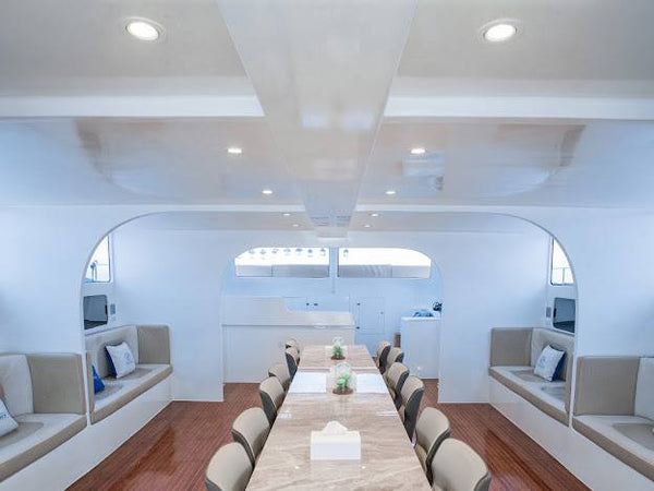 Интерьер выполнен в светлых тонах, с деревянной отделкой и мягкими зонами отдыха. Просторная обеденная зона позволяет комфортно организовать фуршет или праздничный ужин на воде.